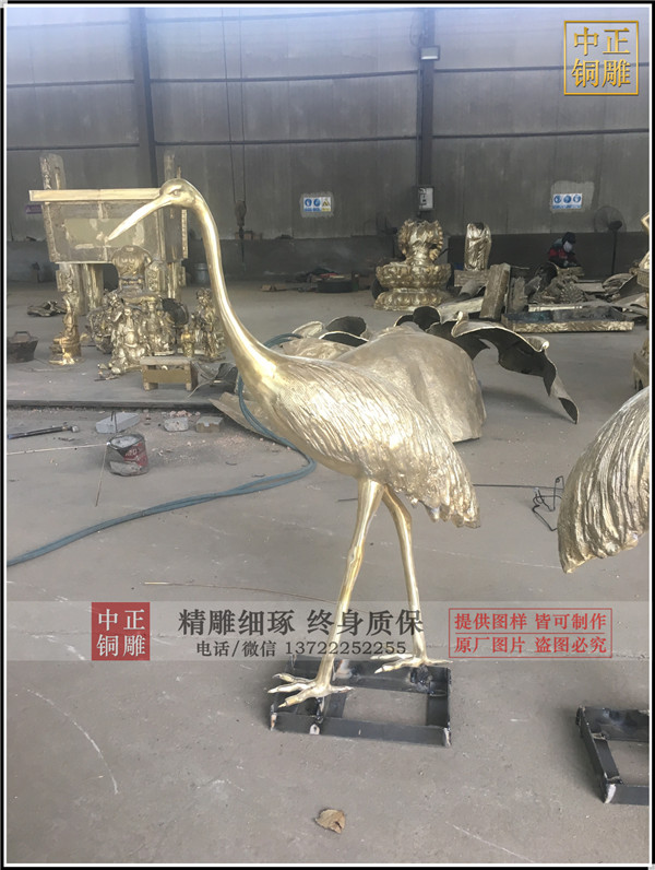 為廣州花都區(qū)定做的銅仙鶴,已將制作好,黃銅制作,表面未做任何效果,等待發(fā)往廣州制作烤漆效果。仙鶴高1米,姿態(tài)生動,腿部下預(yù)埋鐵,方便客戶安裝。